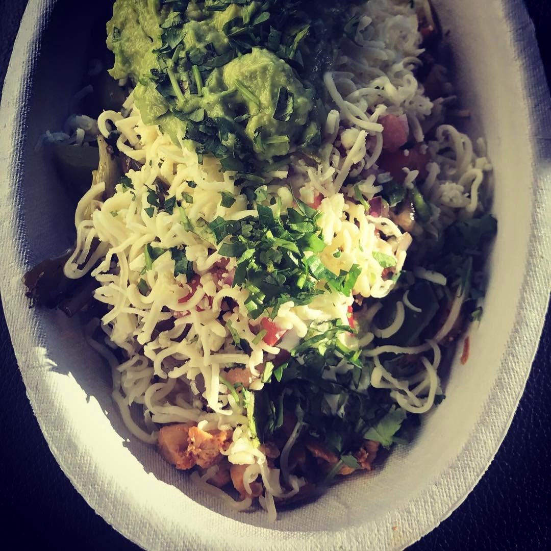 “One of my favorite things to grab on the go: Chipotle. I get the bowl with-grilled chicken, veggies, cheese, lettuce, guacamole, cilantro, and I add Tabasco for flavah!”