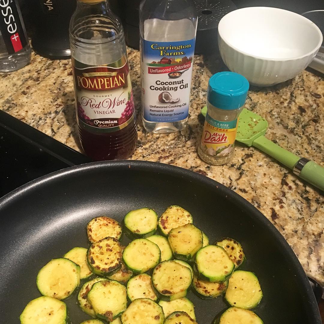 “Zucchini rounds! Sliced about 1/2in think, sautéed in minced garlic and coconut oil…. splash of red wine vinegar and seasoned with garlic and her mrs.dash”