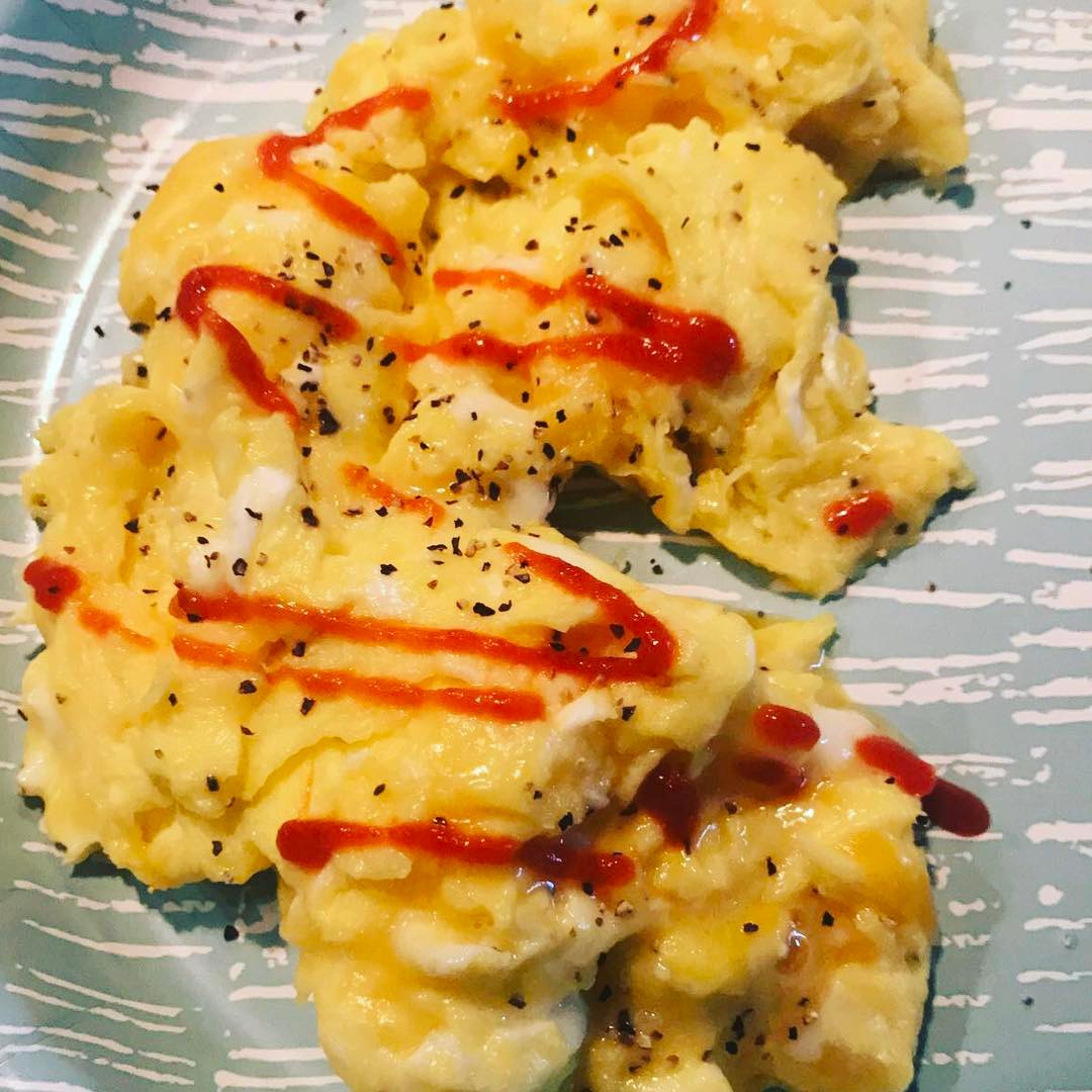 “Breakfast today: three soft scrambled eggs with cheese and sriracha!”