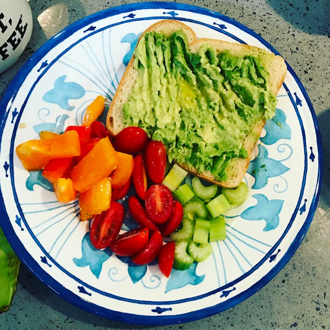 Snacks Through The Day: Bell Peppers, Celery, Cherry tomatoes, Fruit, Avocado Toast.