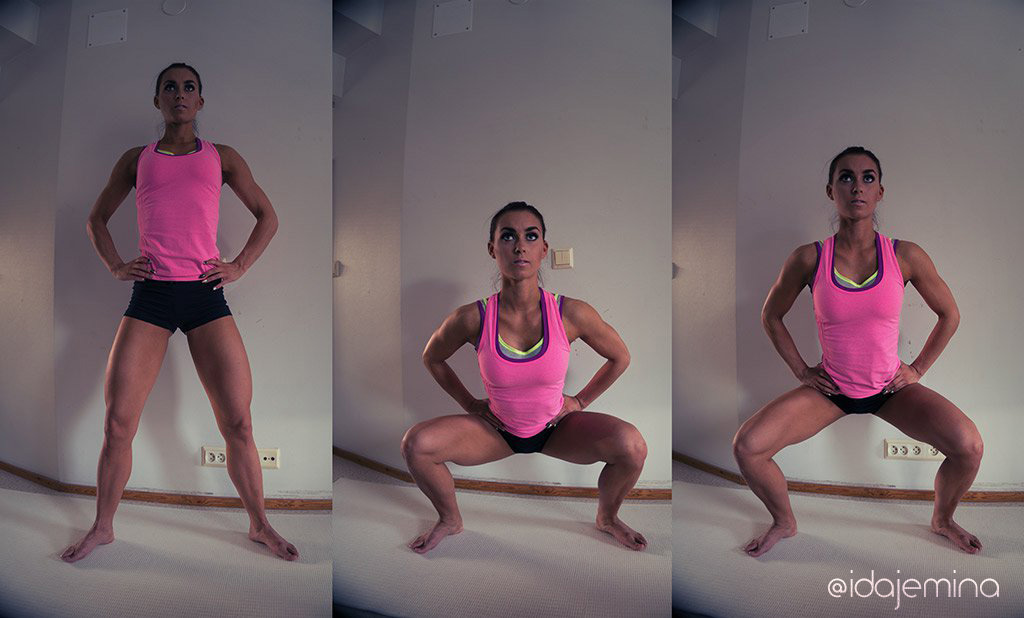 Stand with a wide stance and squat down slowly but don’t come up just yet! Do three small up and down squatting movements before lifting yourself back to an upright position. Feel the burn in your glutes!