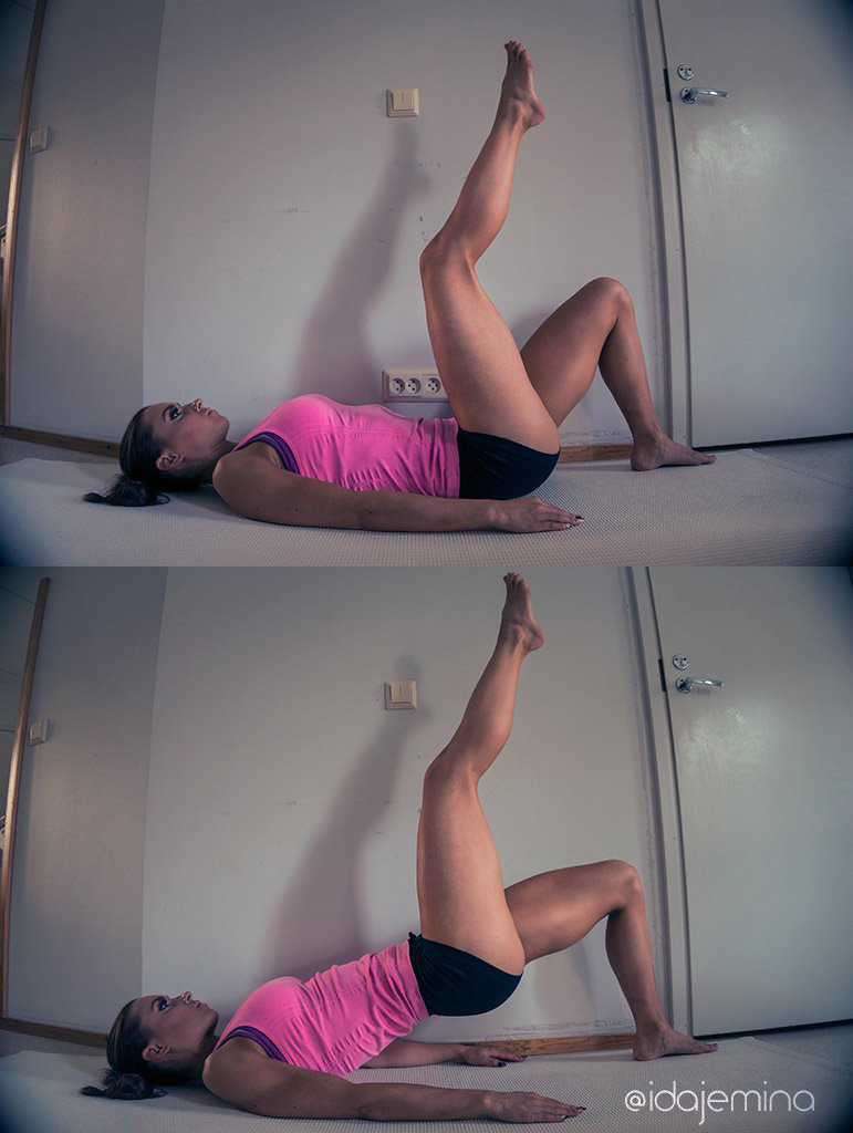 Lay down on your back with your knees bent and then lift one leg up. Push your hip up with your glute and slowly lower it back down. Try to keep your weight on your supporting leg’s heel. You can also do a slightly lighter version of this by keeping both heels on the floor.