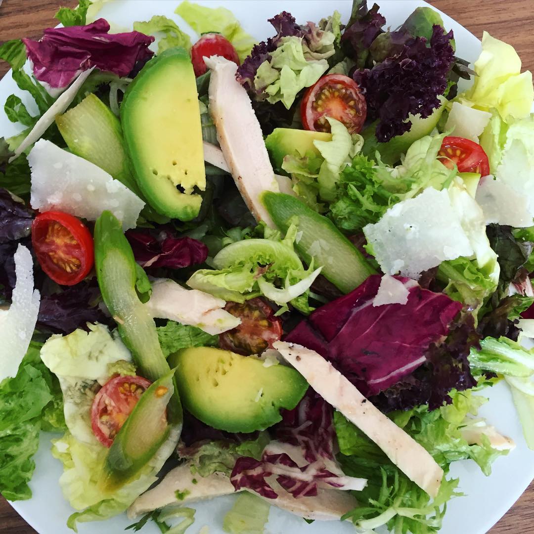 “Lunch today was a chicken and avocado salad with asparagus, cherry tomatoes and shaved parmesan cheese”