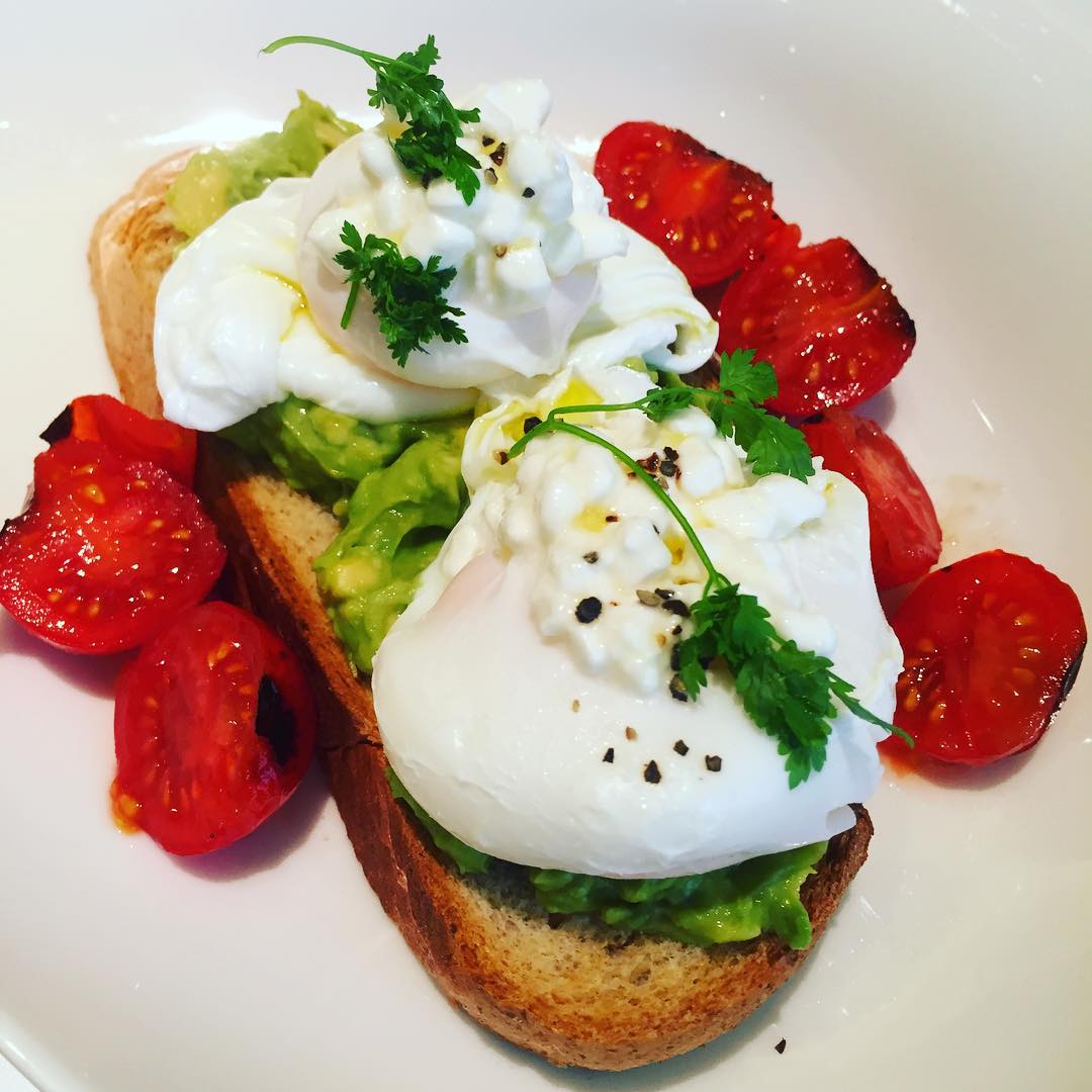 “Avocado toast topped with boiled eggs, cottage cheese and oven-baked cherry tomatoes for breakfast yesterday.”