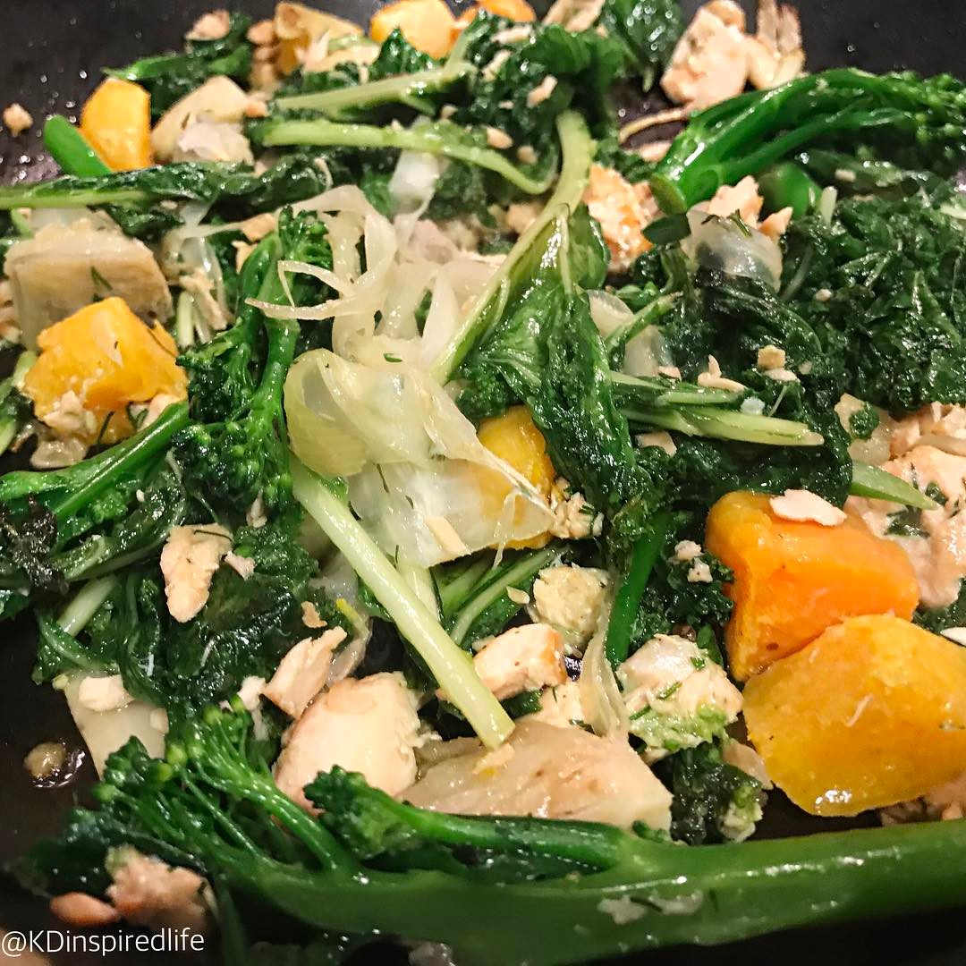 “Best tasting dinner I had this week😍Steamed salmon pieces with broccoli, spinach, roasted pumpkin and sweet potato pieces with some radish. Adding more leafy greens and vegetables to my diet is a big focus right now.”