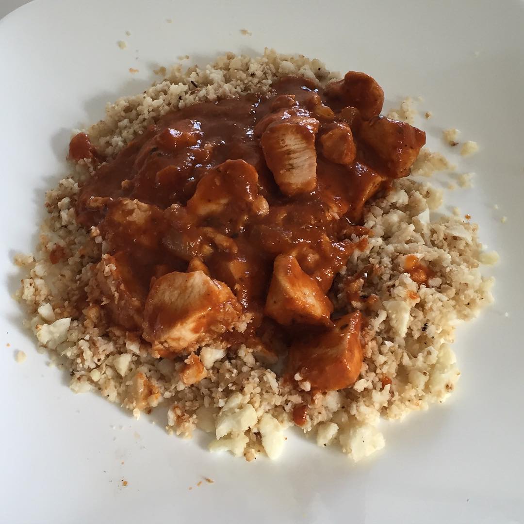 “I wish I had made this look a little prettier but omg it was amazing.. Butter chicken is one of my favorite foods ever and until I found cauliflower rice (just blend cauliflower and throw in the pan for a few mins over medium Heat)”