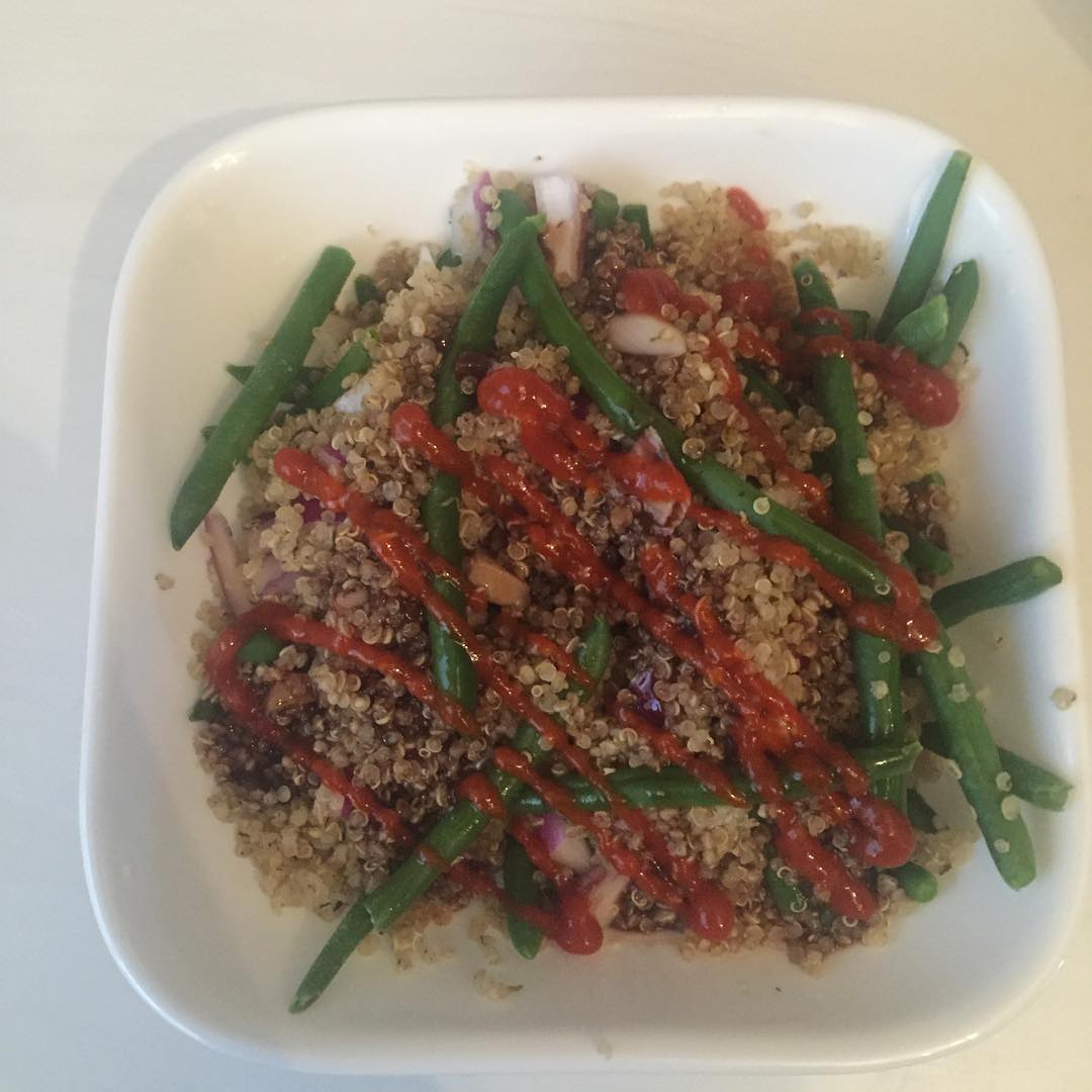“Quinoa and veggies with soy sauce and Siracha. So simple and so good 🙌🏼”