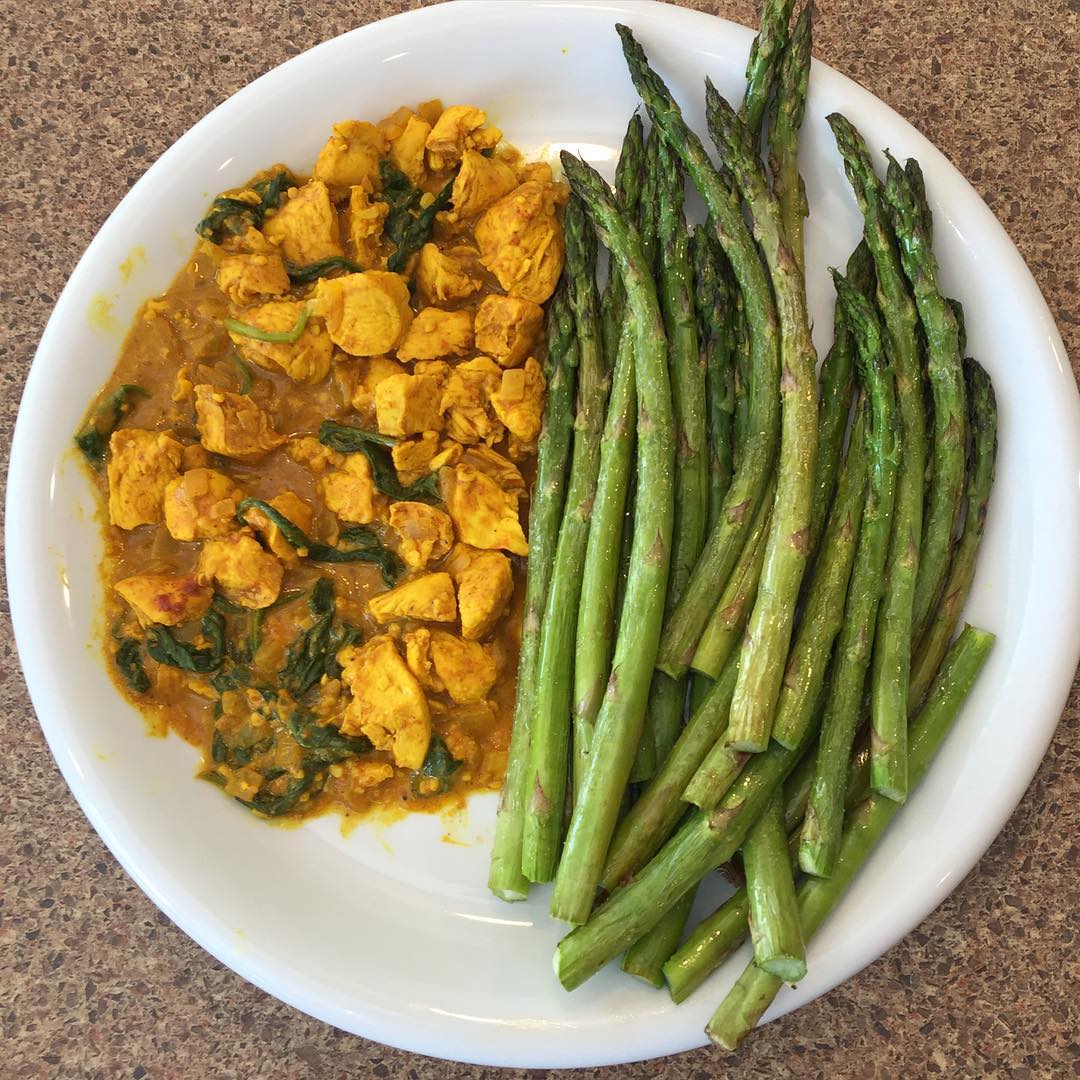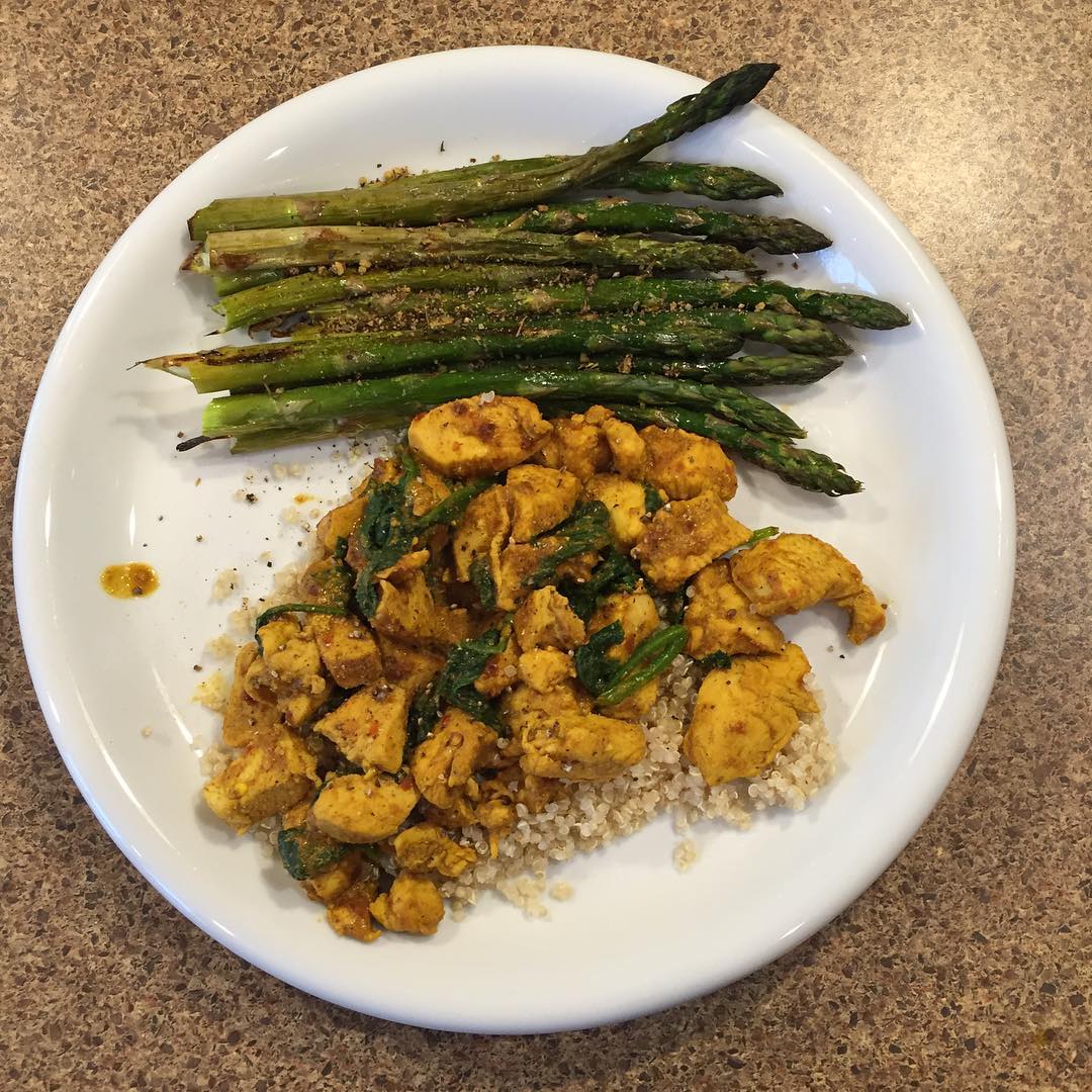 “I swear I eat the same thing every day but it’s sooooo good. All that for around 450 cals! My high carb meal of the day so it has 1/2 scoop of quinoa” Chicken, Quinoa, Asparagus!