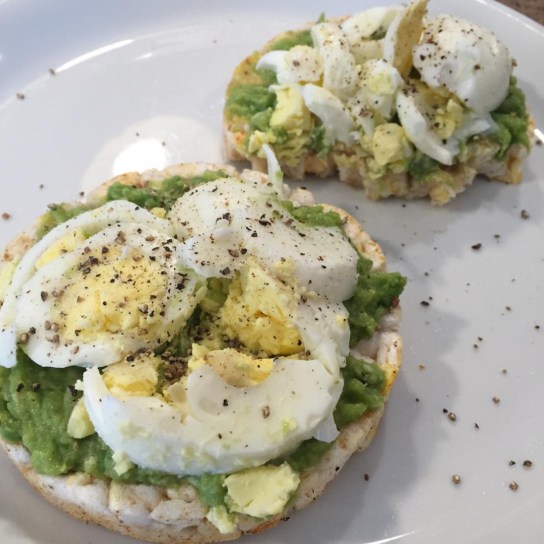 “This has been one of my go to breakfasts lately. Nom nom nom. Quick and simple”. Eggs, Avocado On Rice Cakes.