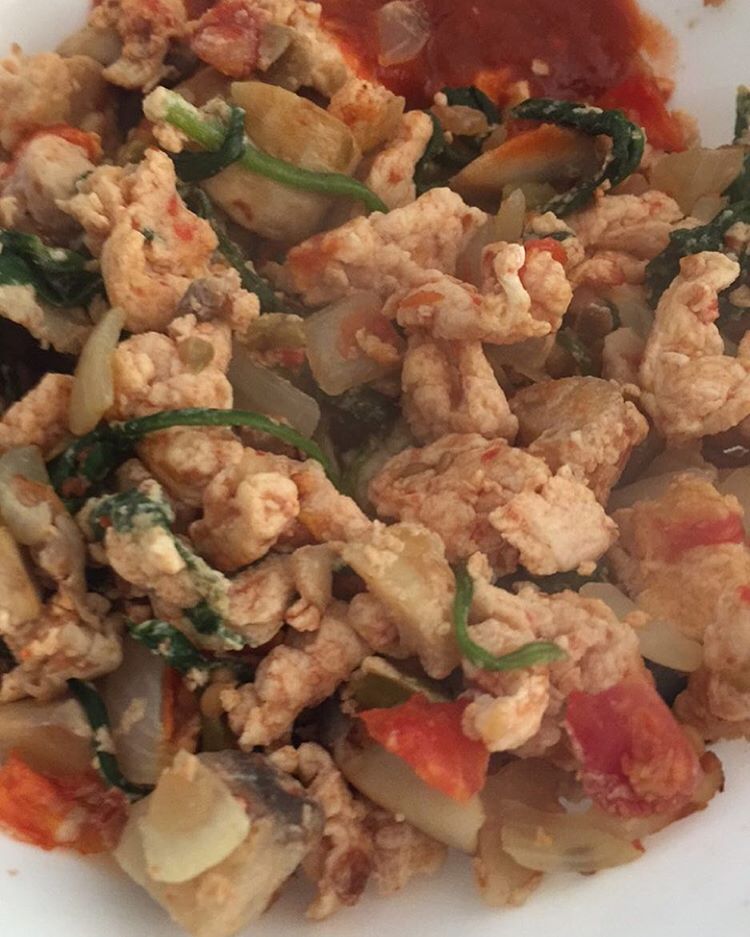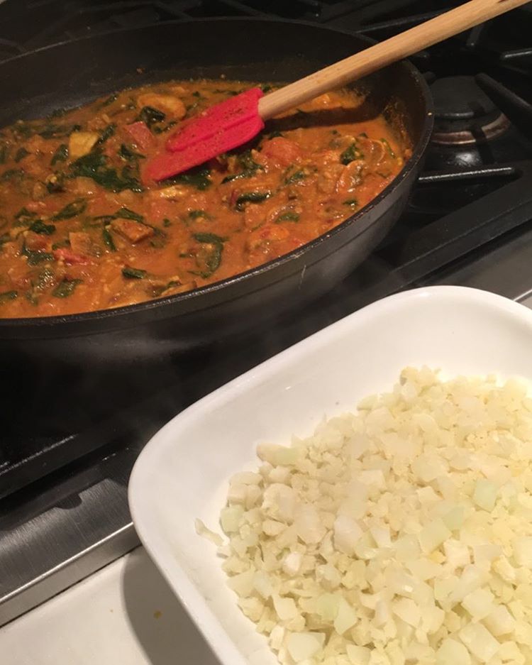“Dinner so yummmy, homemade curry with cauli rice. 1 tbsp curry powder, 1 tbsp minced garlic, 1 cup coconut milk, 1/2 tomato sauce, Mushrooms, Spinach, 1 serving shrimp, Shake some chilli powder and chilli pepper flakes over top.