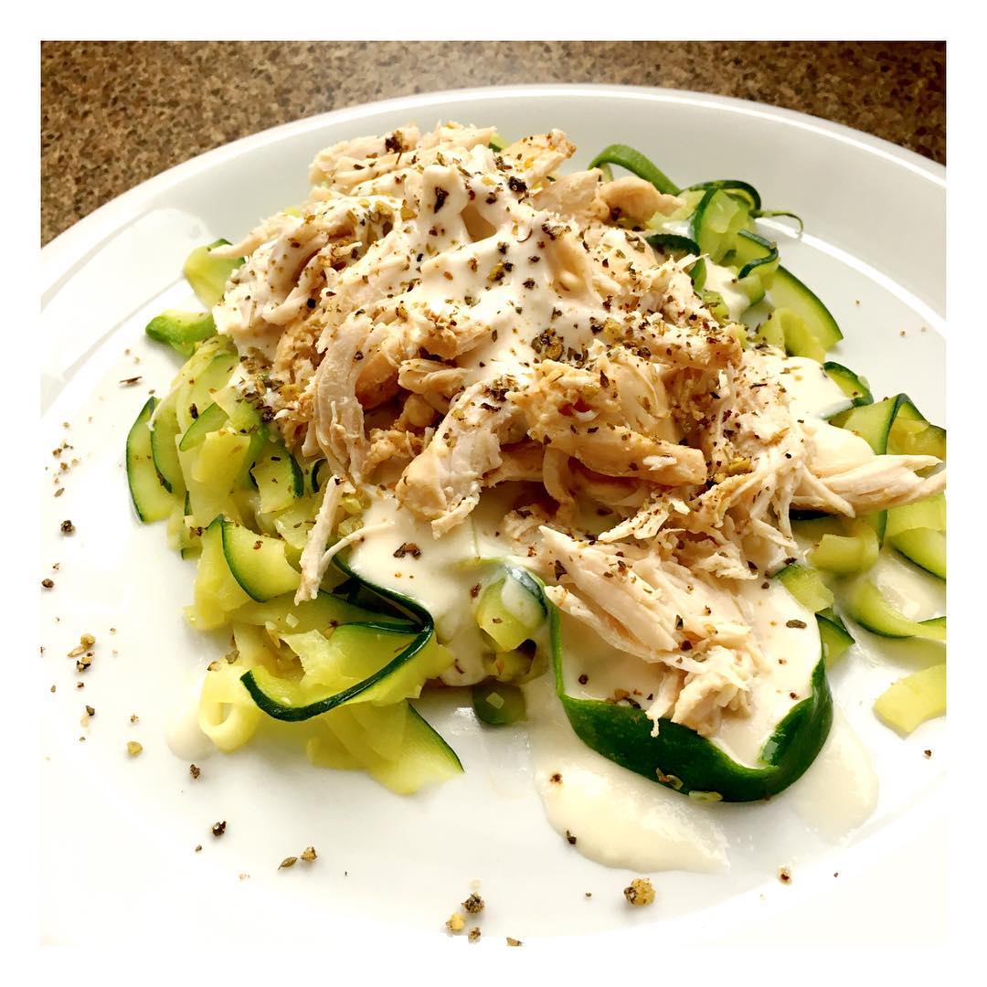 “A favorite meal of mine. Zucchini noodles with chicken and any type of sauce really. I boil chicken breast in chicken broth then shred it and added 1/4 cup of a jar of my fav alfredo sauce. Quick, easy, nutritious!”