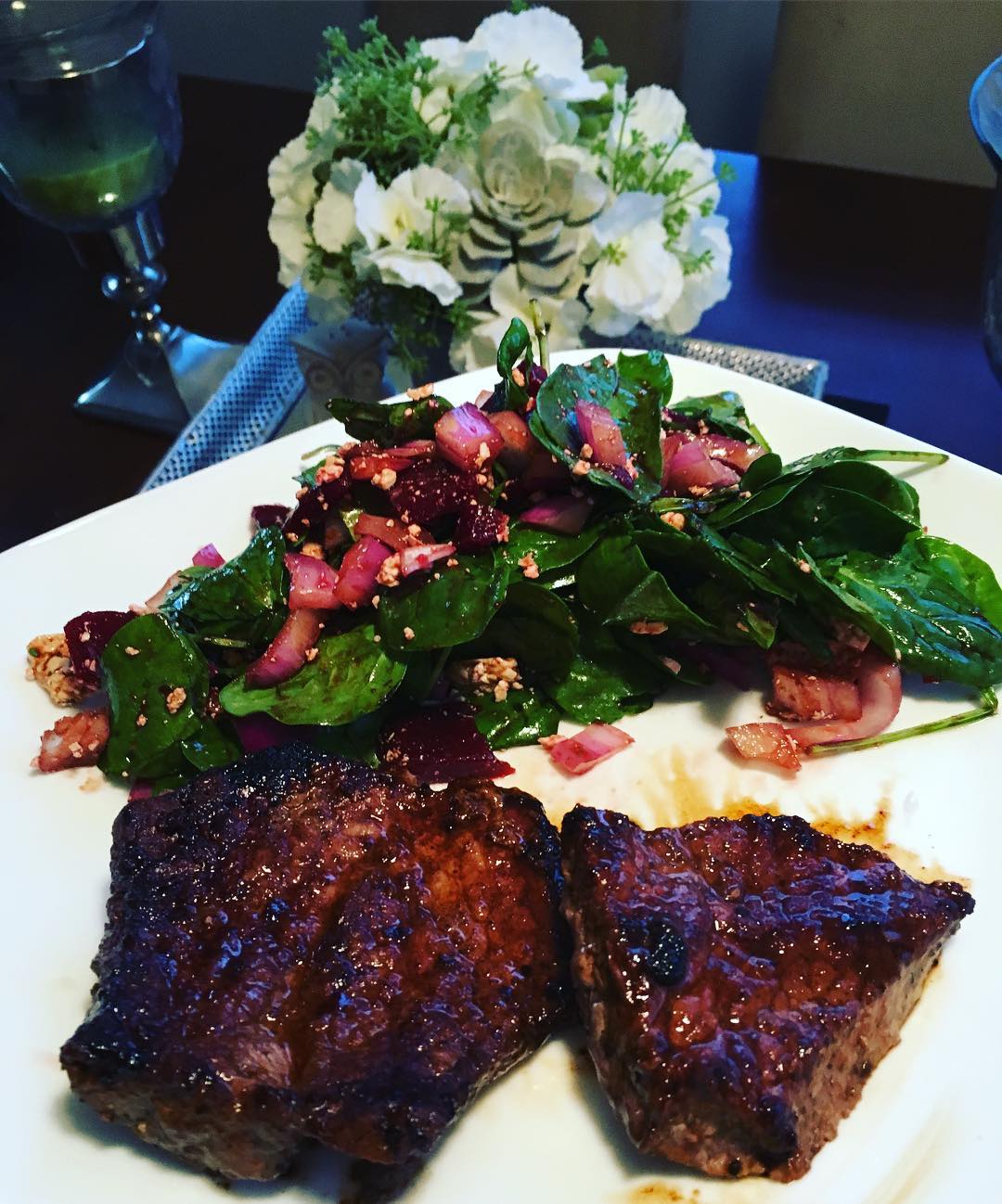 “I decided to treat myself with a nice huge 250 g steak! Paired with beet salad which is a new favorite of mine, just spinach, red onion feta and virgin olive oil and balsamic”