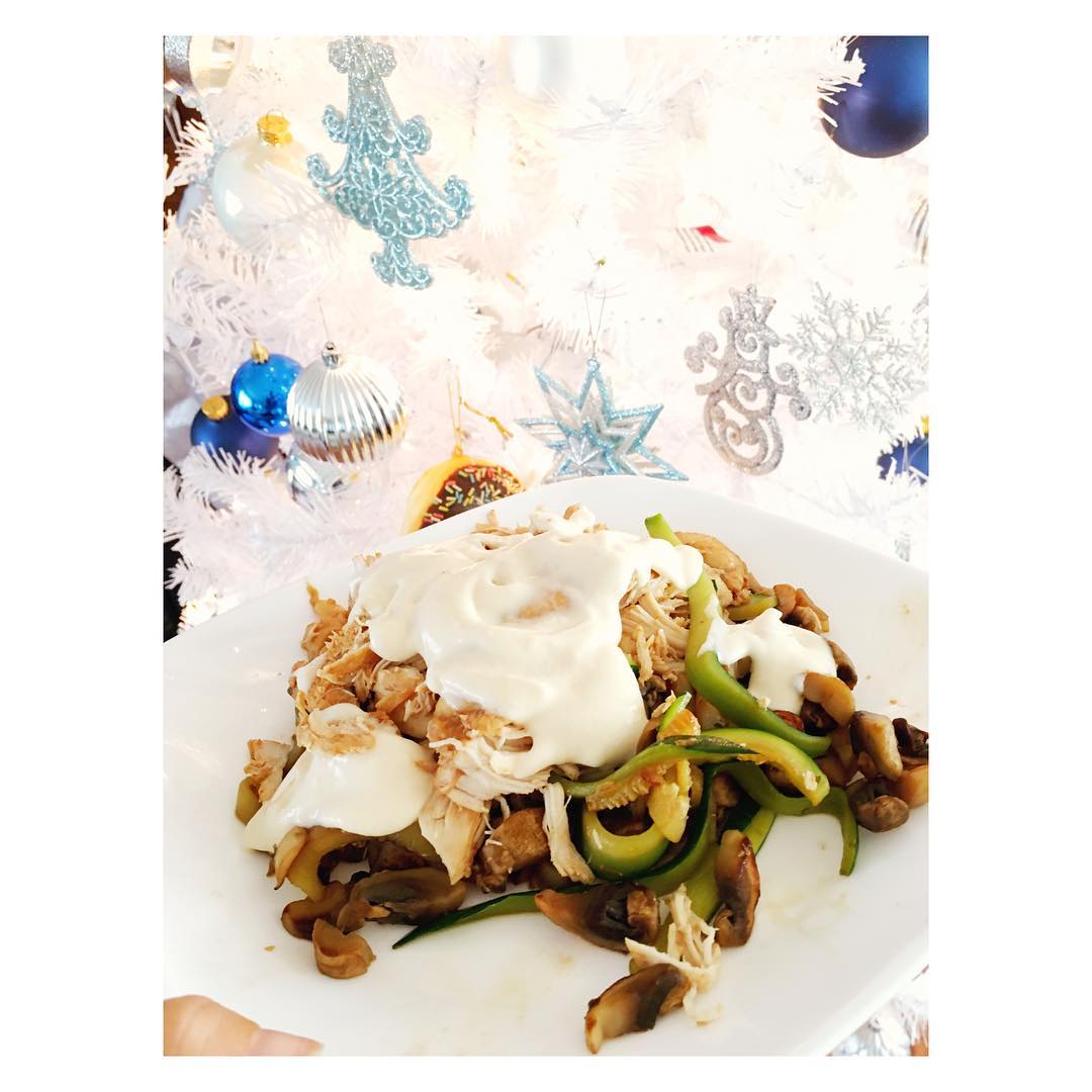 “Another one of my absolutely favorite meals lately. Zucchini noodles and mushrooms with 250g shredded chicken breast and 1/4 cup Alfredo sauce! 16g carbs – 7g fat – 57 protein – 371 calories”