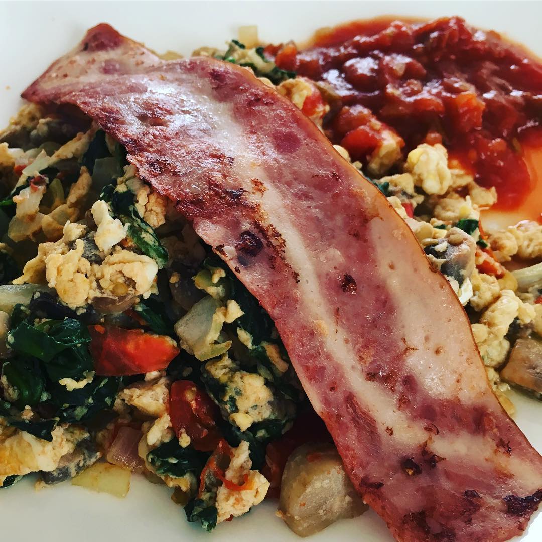 “Would you justtttt look at it. 1/2 cup egg whites and one egg. Chicken bacon. 2 cocktail tomatoes – mushrooms – onion – spinach – salsa”