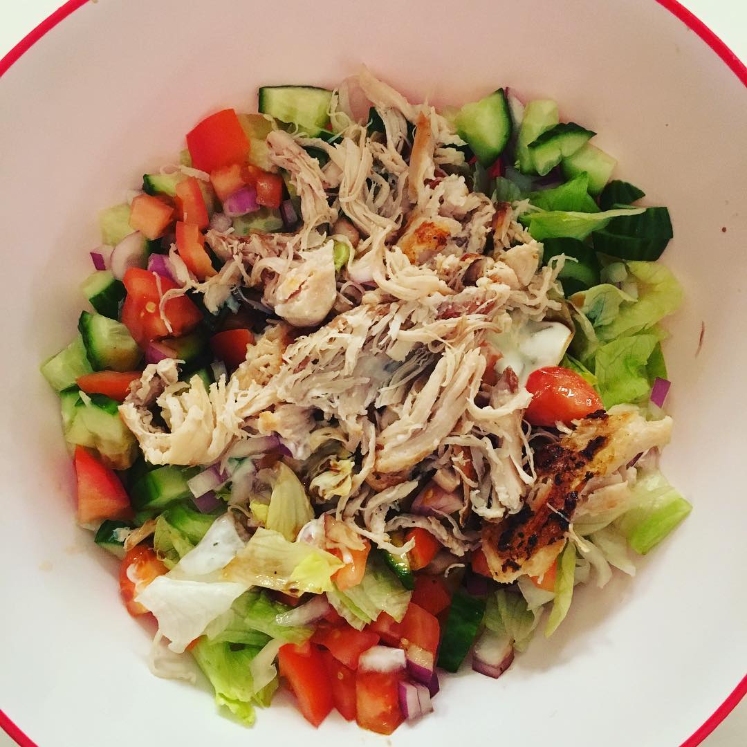 “I never thought years ago I would be so excited to look at lettuce. Ice berg lettuce, 1 Roma tomato, 50g red onion and 100g cucumber 140g shredded chicken. Salad dressing is from ideal protein 3 x 5 cals/tbs (I don’t do the diet I just go into the places to get their dressing) and 1 tbs of bolthouse ranch for 20 cals/tbs”