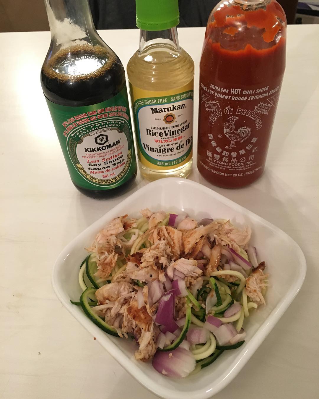 “Zucchini Thai noodle salad. Grilled chicken, red onion, minced garlic and these sauces. Nom nom nom!”