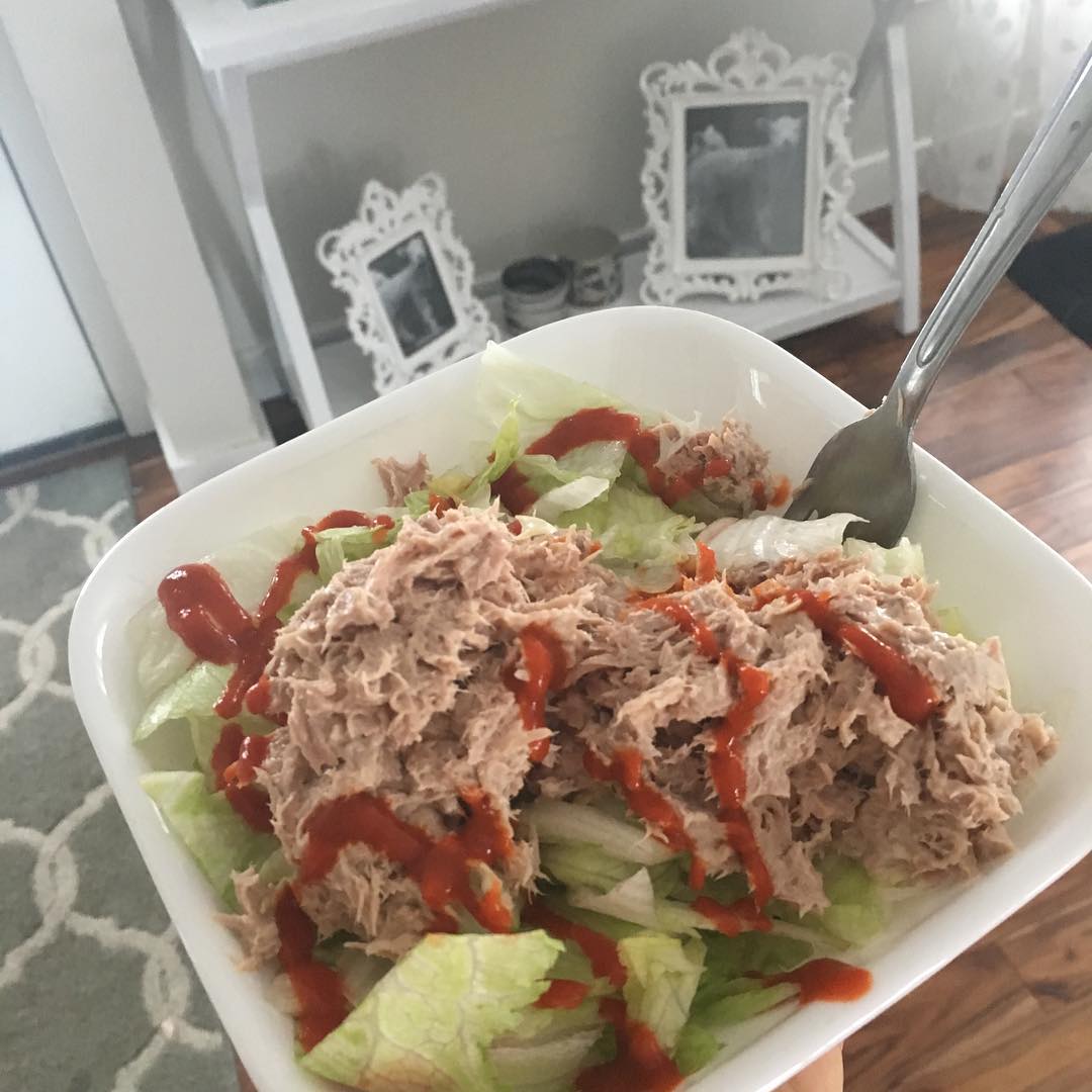 “This is really yummy. Tuna and a bit of reduced fat mayo over iceberg lettuce and Siracha”
