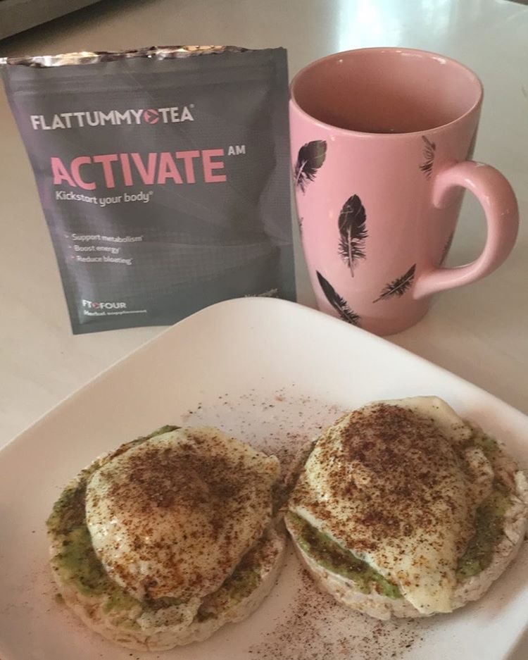 “I’ve had this combo every single day this week. @flattummytea and fried eggs over rice cakes and avocado salsa”