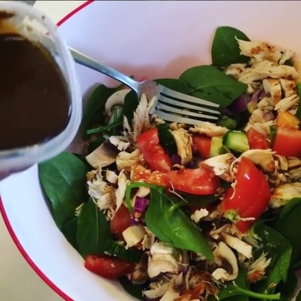 “My favorite salad for dinner. Spinach, tomatoes, cucumber, red onion, mushrooms, shredded chicken (sometimes add Avocado and bell peppers) Salad dressing (Dijon mustard, minced garlic, balsamic vinegar, olive oil, *add zero calorie rice vinegar or apple Cider vinegar until desired taste/consistency)”
