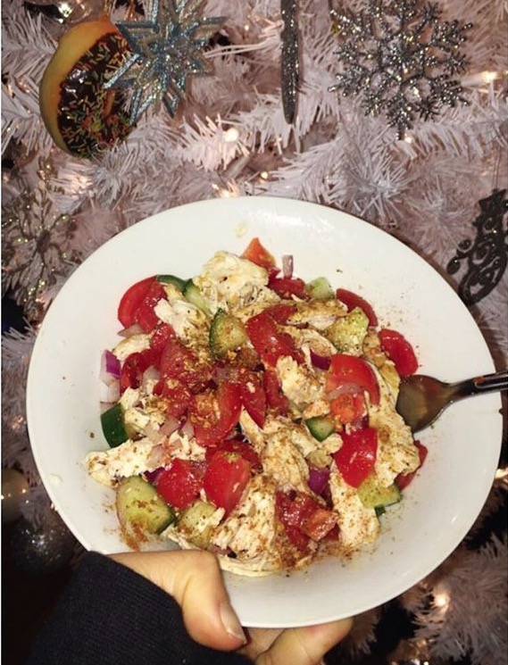 “Mmmm one of my favorite clean dinners. Tomatoes, cucumber, red onion and grilled chicken with apple cider vinegar on top. You don’t get cleaner eats than that!”