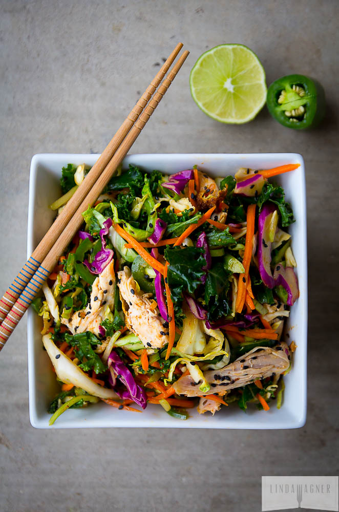 Spicy Asian Chicken Salad. Delicious rainbow coloured salad that is packed full of flavour. LindaWagner.com