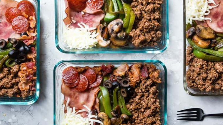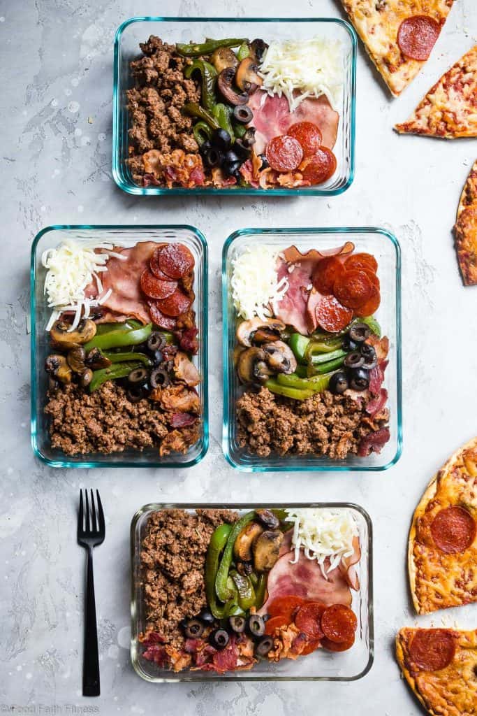 “These Keto Low Carb Pizza Meal Prep Bowls are perfect for both kids and adults to pack for lunches! Gluten free, healthy and paleo and whole30 compliant!”. Recipe: FoodFaithFitness.