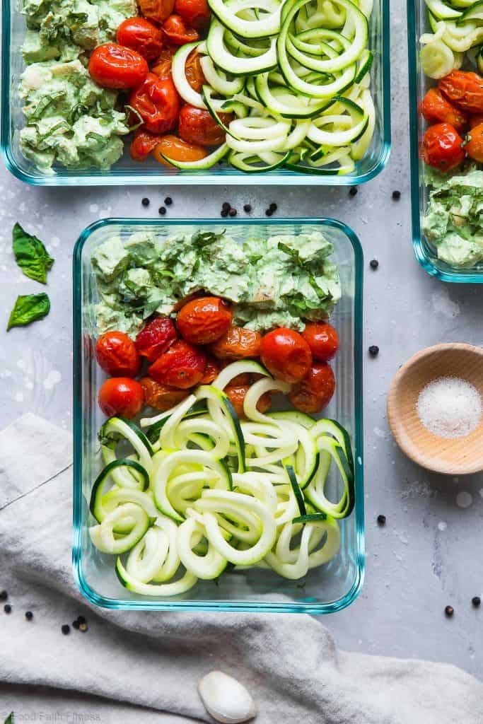 “These pesto chicken meal prep bowls are an easy, low carb, gluten free and protein packed lunch for work! A healthy meal for kids or adults that’s only 260 calories!”. Recipe: FoodFaithFitness.