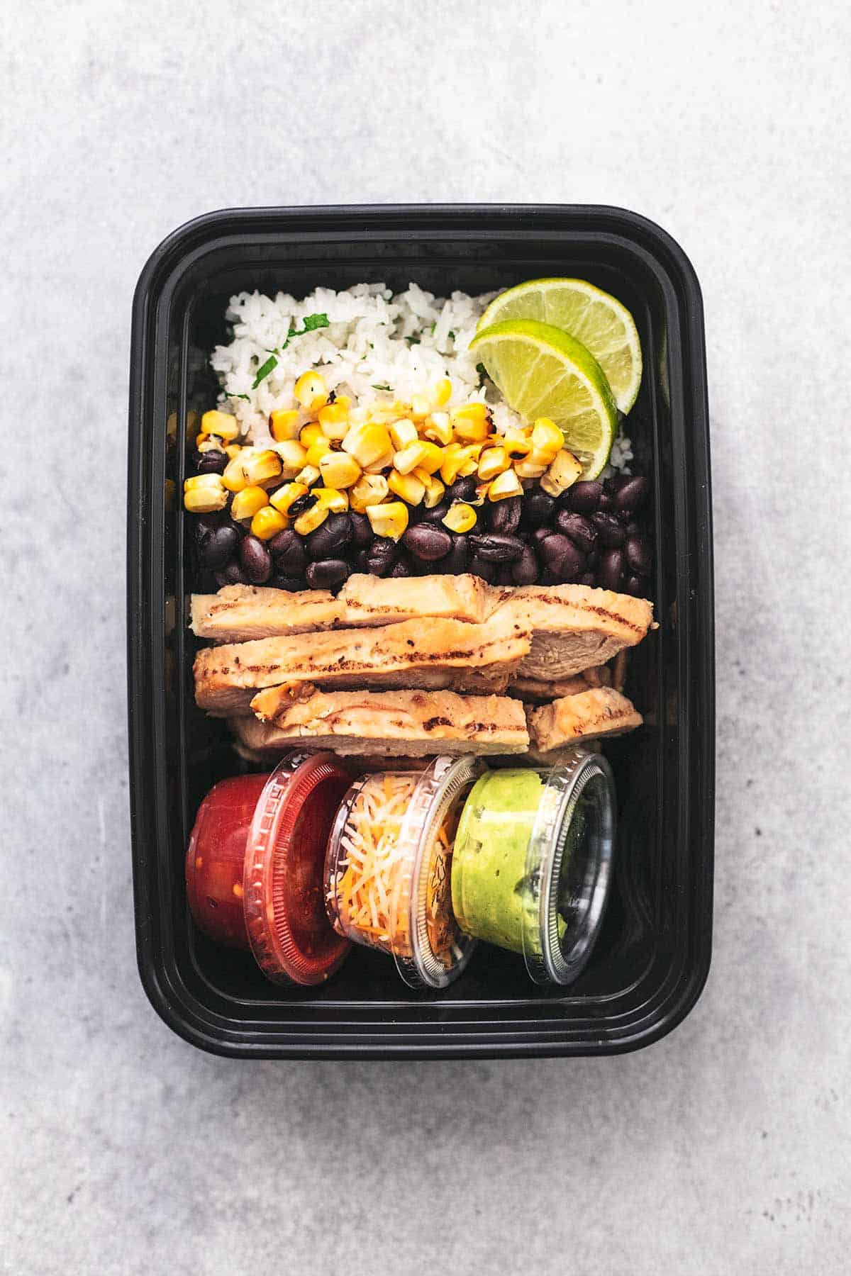 “Meal Prep Chicken Burrito Bowls are the perfect way to eat a healthy, delicious make-ahead meal on the go. Full of beans, rice, chicken, avocado, tomato, and all the toppings you want on a burrito, packed up together in an easy meal prep container. “. Recipe: LeCremeDeLaCrumb.
