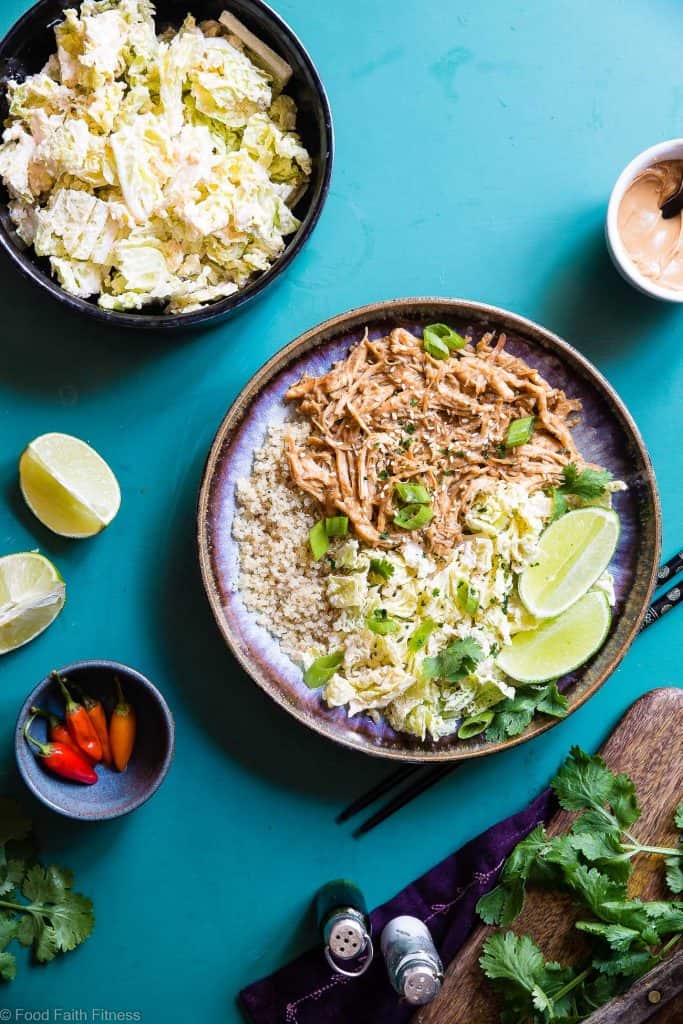 “This CREAMY Slow Cooker Thai Peanut Butter Chicken is mixed with quinoa and a spicy cabbage slaw to make a family friendly, gluten free and healthy meal! “. Recipe: FoodFaithFitness.