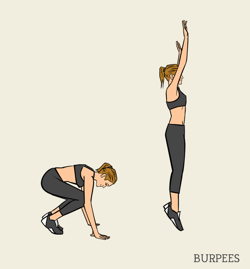 How To Perform Burpees: Stand with your body neutral and relaxed, straight up, with your shoulders back, head facing forward and feet shoulder-width apart. Drop into a squat position with your hands touching the floor. Kick your feet back, while keeping your hands on the floor and your arms extended. Kick your legs back up towards your hands and raise back up into the squat position before standing up fully. This is one complete rep.