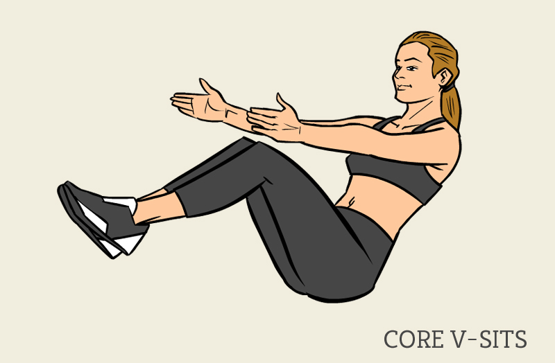 How To Perform V-Sits: Start on the floor in a seated position with your knees bent and feet off the floor. With your arms out by your side, parallel to the floor, head neutral and back straight, slowly lower your upper and lower body back down towards the floor. Use your abs to return to the starting position, keeping your core fully engaged throughout the motion.