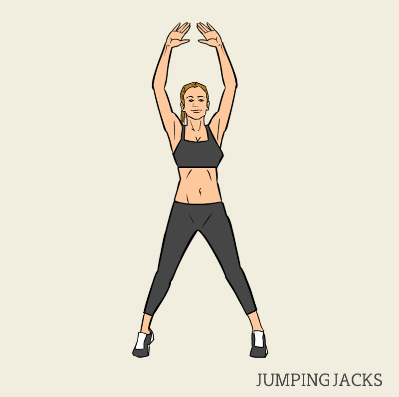 How To Perform Jumping Jacks: Stand with your body neutral and relaxed, straight up, with your shoulders back, head facing forward and feet together. Keep your arms by your sides. Jump while raising your arms over head and land with your feet slightly wider than shoulder width apart. Jump again and return your arms and legs back to the start position to complete one rep.