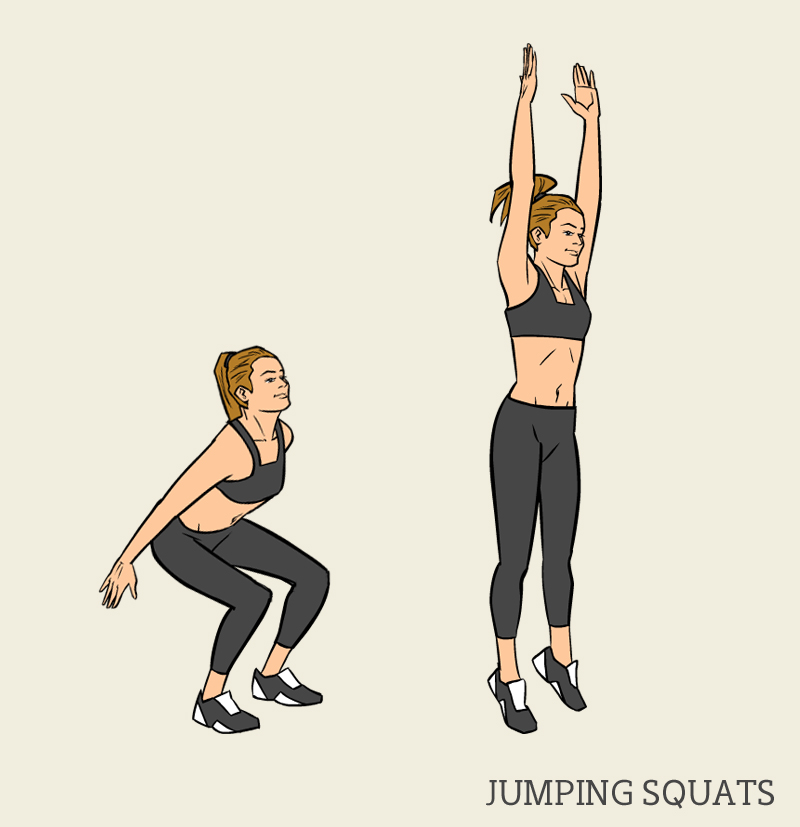 How To Perform Jumping Squats: Stand with your body neutral and relaxed, straight up, with your shoulders back, head facing forward and feet shoulder-width apart. Perform a regular squat then explosively jump up, raising your arms in the air. As you land, lower back down into a controlled, smooth squat position again to complete the rep. Land with your knees slightly bent and on the balls of your feet.