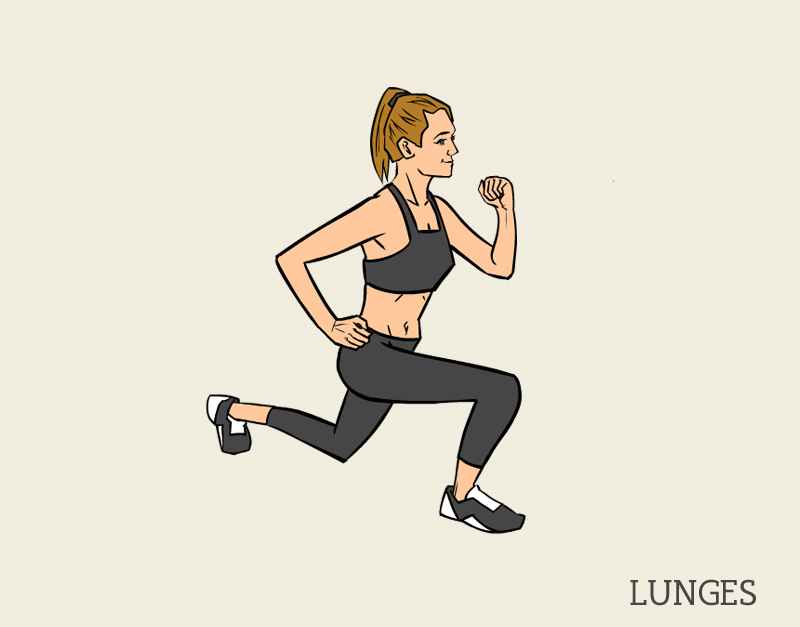 How To Perform A Lunge: Keep your body neutral and relaxed, straight up, with your shoulders back and head facing forward. Keeping your core engaged, step forward with your right leg, and lower your hips down until both knees are bent at a right angle (90-degrees). Lift yourself back into your starting position and repeat with the opposite leg.