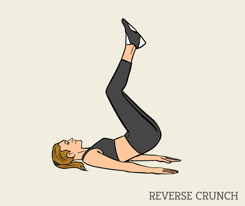 How To Perform Reverse Crunches: Lie with your back on the floor with your hands either behind your head, or by your side. Bring the knees up in towards the chest until they are bent at a right angle (roughly 90-degrees). Engage your abs, contracting them to curl your hips up off the floor and towards your upper body, extended your legs up towards the ceiling. Lower yourself back down into the starting position, keeping your feet from touching the floor. It is important to keep this motion smooth and controlled, and not to use momentum to swing your legs and hips up.