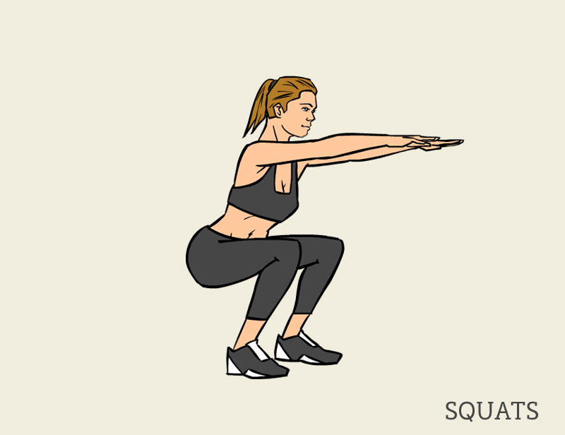 How To Perform Squats: Stand with your body neutral and relaxed, straight up, with your shoulders back, head facing forward and feet shoulder-width apart. Engage your core and bend your knees by lowering your hips down, until your thighs are approximately parallel to the floor, keeping the weight on your heels. Rise back up, keeping your spine neutral, straightening your legs and squeezing your glutes at the end of the motion. During the exercise, you can hold your arms out in front of you or at your side.