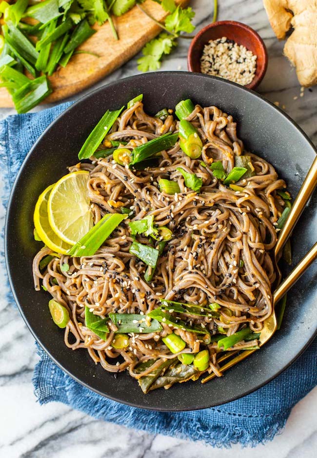 “Fresh aromatics sautéed and seasoned with spicy chili paste, soy sauce, peanut butter and sweetened with a touch of sugar make for a quick and easy noodle sauce. Make this dish in 15 minutes tops for a simple yet speedy noodle dish that will leave wanting more! | Gluten Free + Vegan”. Recipe: ASaucyKitchen.