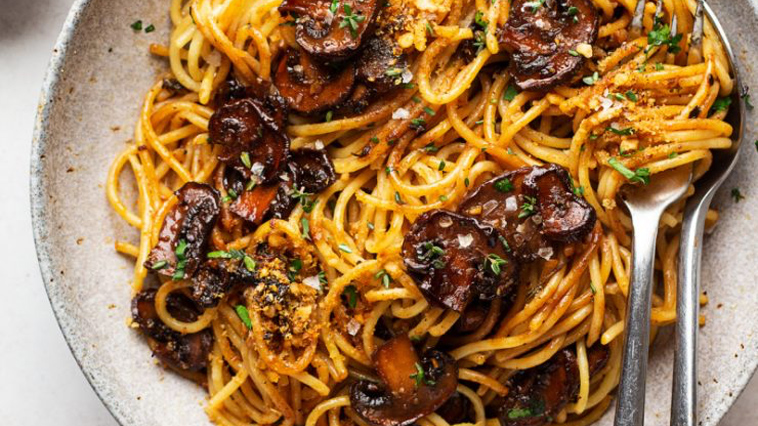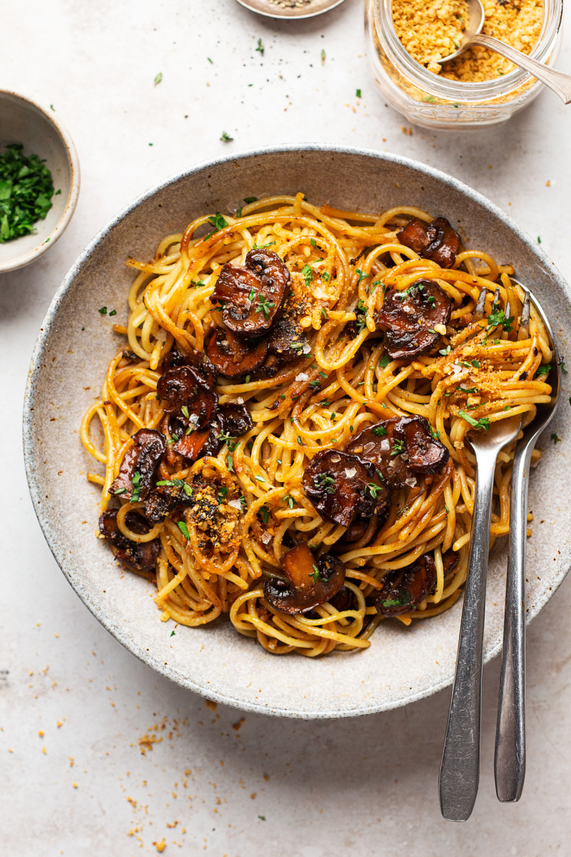 “A quick recipe for vegan mushroom and spinach pasta that is ready in under 30 minutes. Loaded up with sautéed balsamic mushrooms and fresh spinach, all tossed in a heavenly creamy cashew sauce.”. Recipe: VeganRicha.