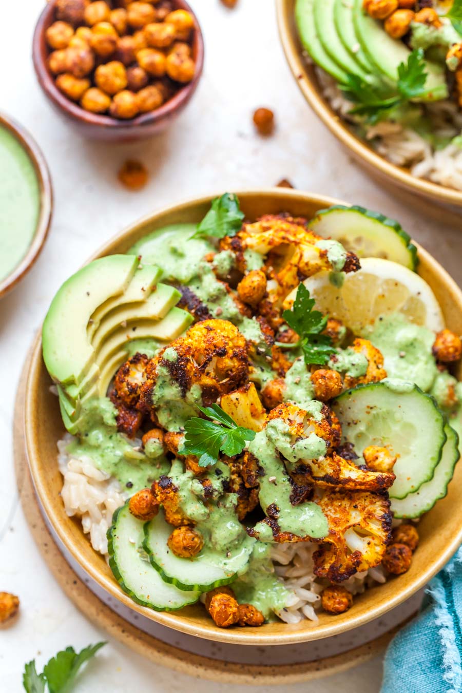 “Cauliflower Shawarma Bowls with crispy chickpeas, basmati rice, and Green Tahini Sauce. These vegan and gluten free bowls are perfect for meal prep lunch or easy weeknight dinner. “. Recipe: DishingOutHealth.