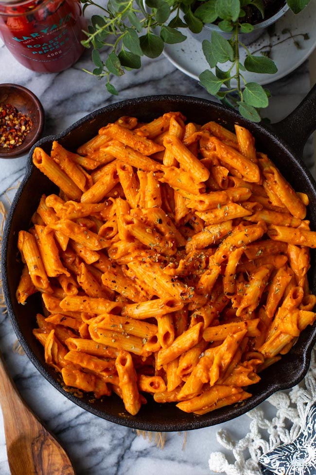 “Gluten free penne cooked and coated in a thick and velvety garlic and roasted red pepper pasta sauce. Make this dish in about 20 minutes with only 10 total ingredients – most of which you likely already have on hand! | Gluten Free + Vegan”. Recipe: ASaucyKitchen.