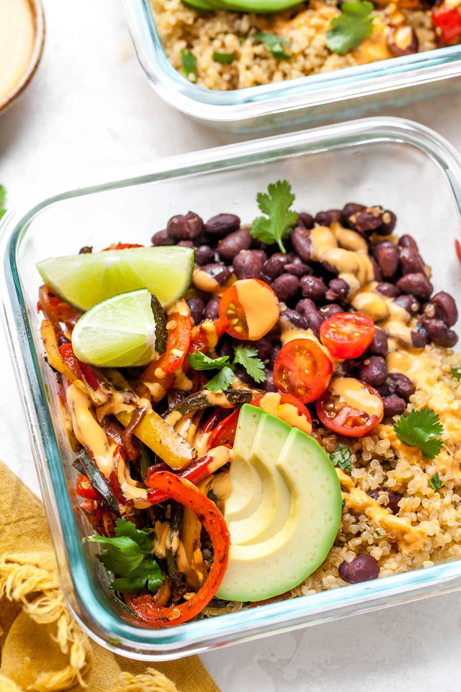 “Vegan Chipotle Bowls with black beans, sautéed peppers and onions, and chipotle cashew cream. These healthy, gluten free bowls are perfect for make-ahead lunches or easy weeknight dinner.”. Recipe: DishingOutHealth.