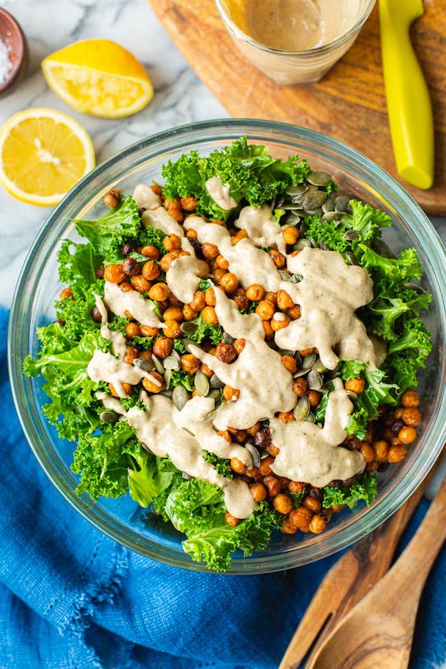 “If you like hummus you’ll love this Roasted Chickpea Kale Salad – chickpeas are lightly spiced and roasted until crispy and then tossed in a bed of massaged kale and topped with a creamy tahini dressing. This salad takes all of your favourite hummus flavours and combines them into one simple, yet tasty salad. | Vegan + Gluten Free”. Recipe: ASaucyKitchen.