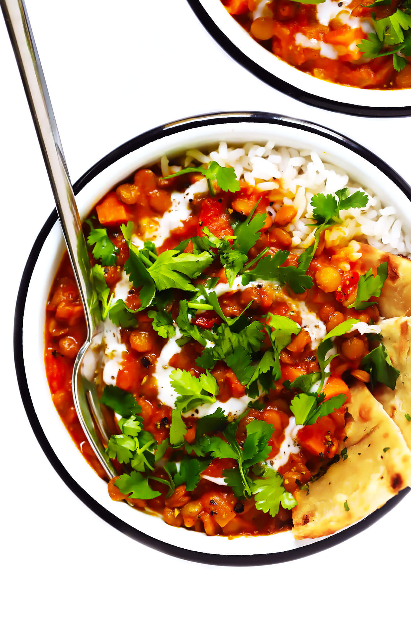 “This cozy tomato lentil curry recipe is made with the most delicious coconut curry tomato broth, it’s naturally gluten-free and vegan, plus it’s a breeze to make and always a crowd fave.”. Recipe: GimmeSomeOven.