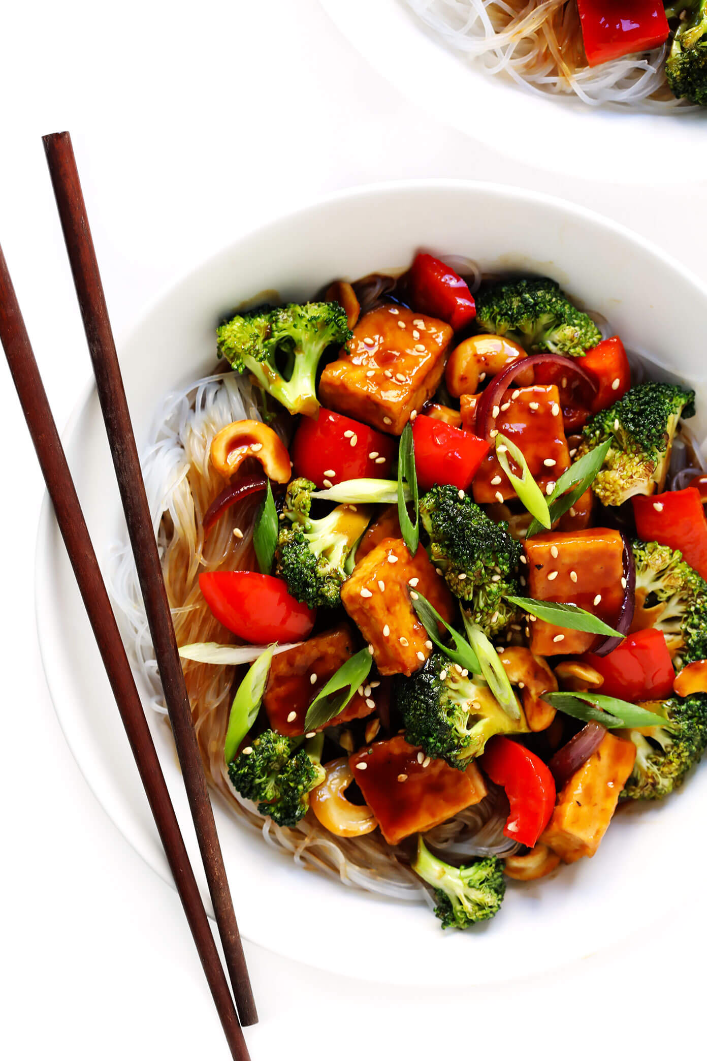 “This Cashew Tofu stir-fry is loaded up with healthy veggies, crispy tofu, roasted cashews, and tossed with a simple ginger stir-fry sauce. It’s a quick and easy weeknight dinner, and also naturally gluten-free and vegan!”. Recipe: GimmeSomeOven.