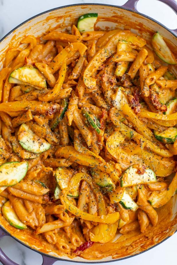 “If you’re looking for the ultimate EASY vegan dinner then this Creamy Tomato ONE POT Pasta is your girl! It comes together with a handful of pantry staples and if needed, the veggies could easily be swapped for frozen veggies of your choosing.”. Recipe: ASaucyKitchen.