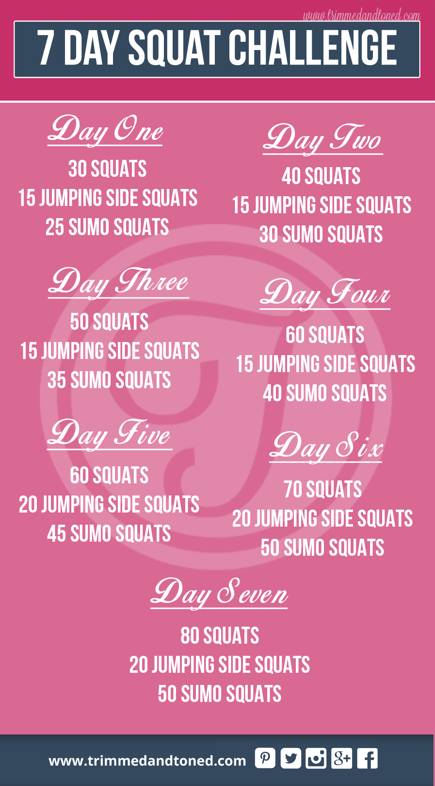Amazing 7 day squat challenge to help you kick start your weight loss and increase your lower body strength! Combining three simple yet incredibly effective and athletic moves to get you started on your fitness path. This would be great for a newcomer who is looking to really challenge themselves or it would also be great for someone more experienced who is looking for a little extra challenge with something they could add on to their weekly workout.