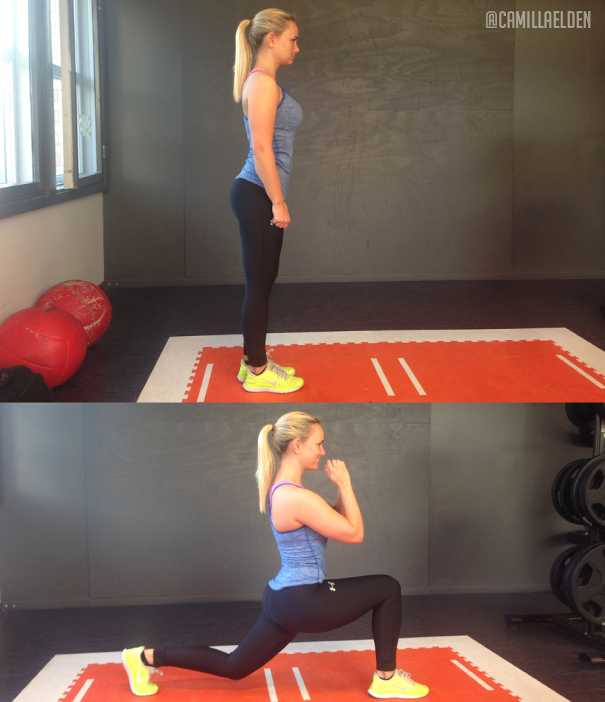 2. Step forward with one leg, lowering your hips until your knees are bent at a 90-degree angle. Keep your front knee directly above your ankle and make sure your other knee stays just above the floor. Keep the weight on your heels and push back up to the position you started from.